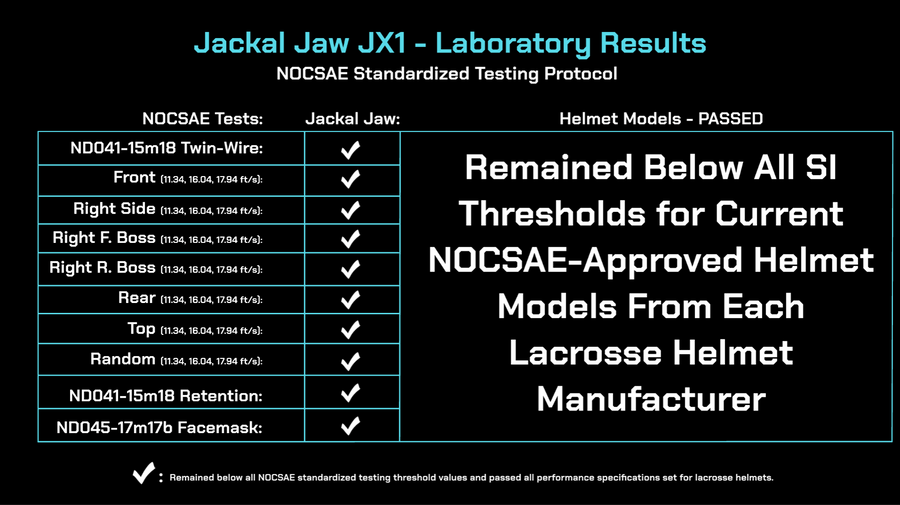 The Jackal Jaw JX1 is an unaffiliated, independent aftermarket chinstrap for use in the sport of field lacrosse. Jackal Jaw is not endorsed by, sponsored by, or otherwise partnered with any lacrosse helmet manufacturer. NOCSAE does not have a category for add-on equipment. Therefore, Jackal Jaw's JX1 is not eligible for NOCSAE certification on its own. For this reason, we had a NOCSAE certified laboratory test Jackal Jaw's JX1 according to the proper protocols to ensure its use did not affect the helmet’s ability to pass the NOCSAE standard. All helmets tested passed the requirements for recertification with Jackal Jaw's JX1. Jackal Jaw's JX1 was tested on the NOCSAE Lacrosse ND041-15m18 Twin-Wire Drop Test using the recommended NOCSAE headform. Jackal Jaw's JX1 test results remained below the peak Severity Index (SI) threshold of 1200 SI for all locations and drop velocities set by NOCSAE, including each of the 11.34 ft/s tests not to exceed 300 SI. Jackal Jaw's JX1 was tested on the NOCSAE Lacrosse ND041-15m18 Helmet Stability/ Retention Testing (Chin Cup). Using the correct NOCSAE headform, the JX1 underwent positional stability tests. Upon completion of the tests, each helmet remained on the headform, as required. Jackal Jaw's JX1 was tested on the ND045-17m17b NOCSAE Lacrosse Standard Impact Test using the recommended NOCSAE headform. This test impacts the helmet’s facemask at 70 mph at two locations using a NOCSAE-certified lacrosse ball. All NOCSAE lacrosse helmet certification tests were completed with current NOCSAE-certified helmets from each manufacturer. All performance specifications were passed when using Jackal Jaw's JX1.